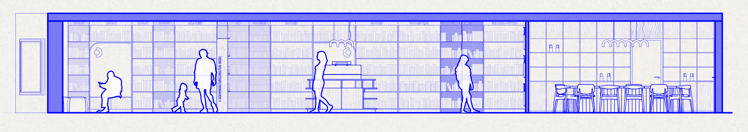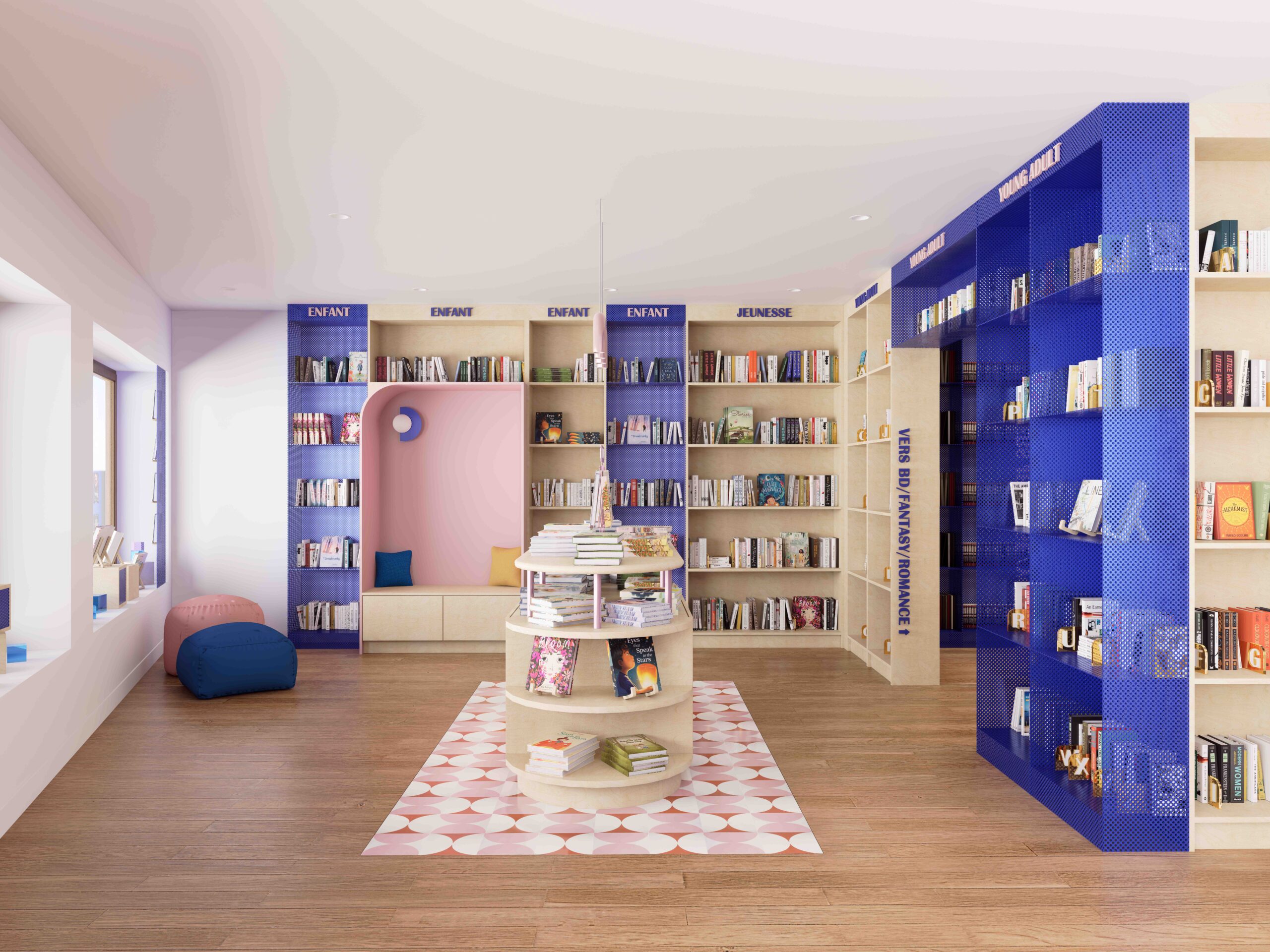 Dans ce projet, chaque élément — rayonnages, mobilier, circulation, éclairage — a été pensé comme un outil de narration. Les formes droites, la symétrie et le travail du bleu (ma signature visuelle) créent un univers reconnaissable et affirmé.