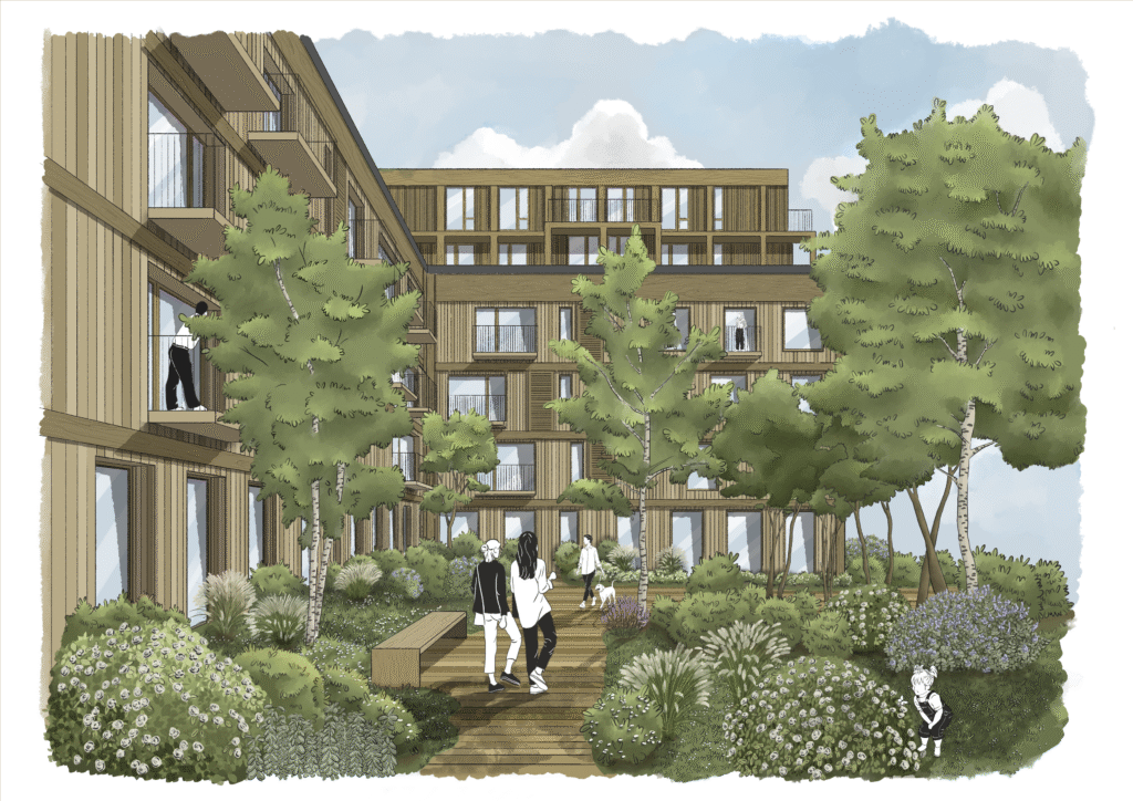 alt="Illustratrice en architecture – illustration d’un ensemble résidentiel en bois autour d’un cœur d’îlot végétalisé"