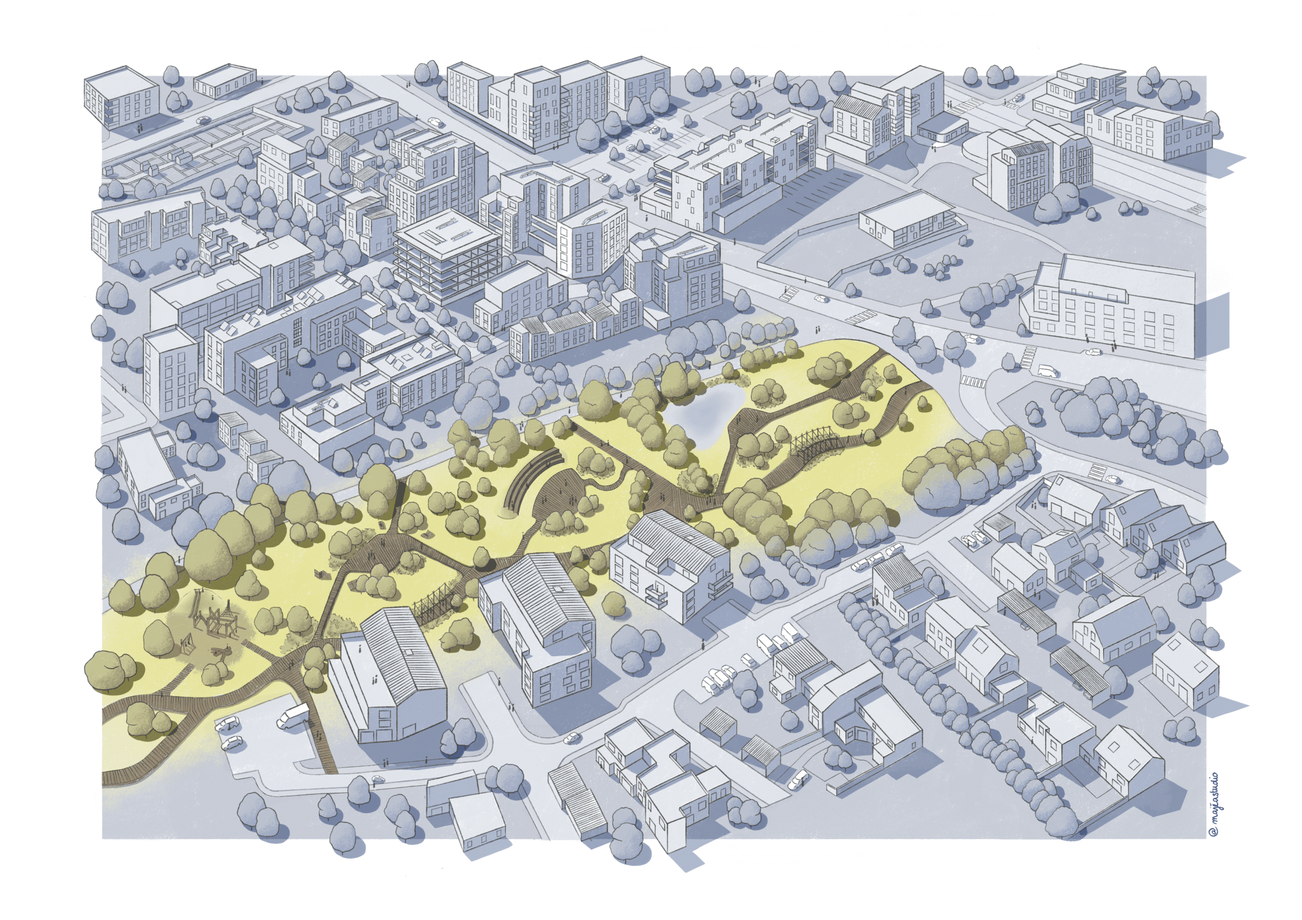 alt="Illustratrice en architecture -illustration axonométrique d'un parc urbain paysage au cœur d'un quartier résidentiel"